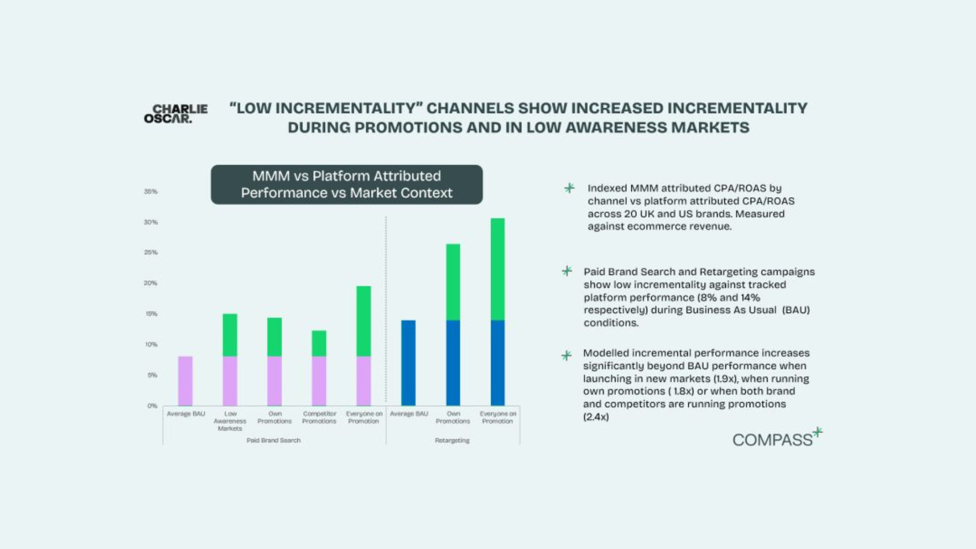 At Charlie Oscar, we run always-on MMM alongside platform-based attribution for every campaign, so we can monitor changes in incremental performance and understand how these external factors affect channel performance. Over time, we’ve identified some key learnings that should influence budget allocation across these low-incrementality channels.
